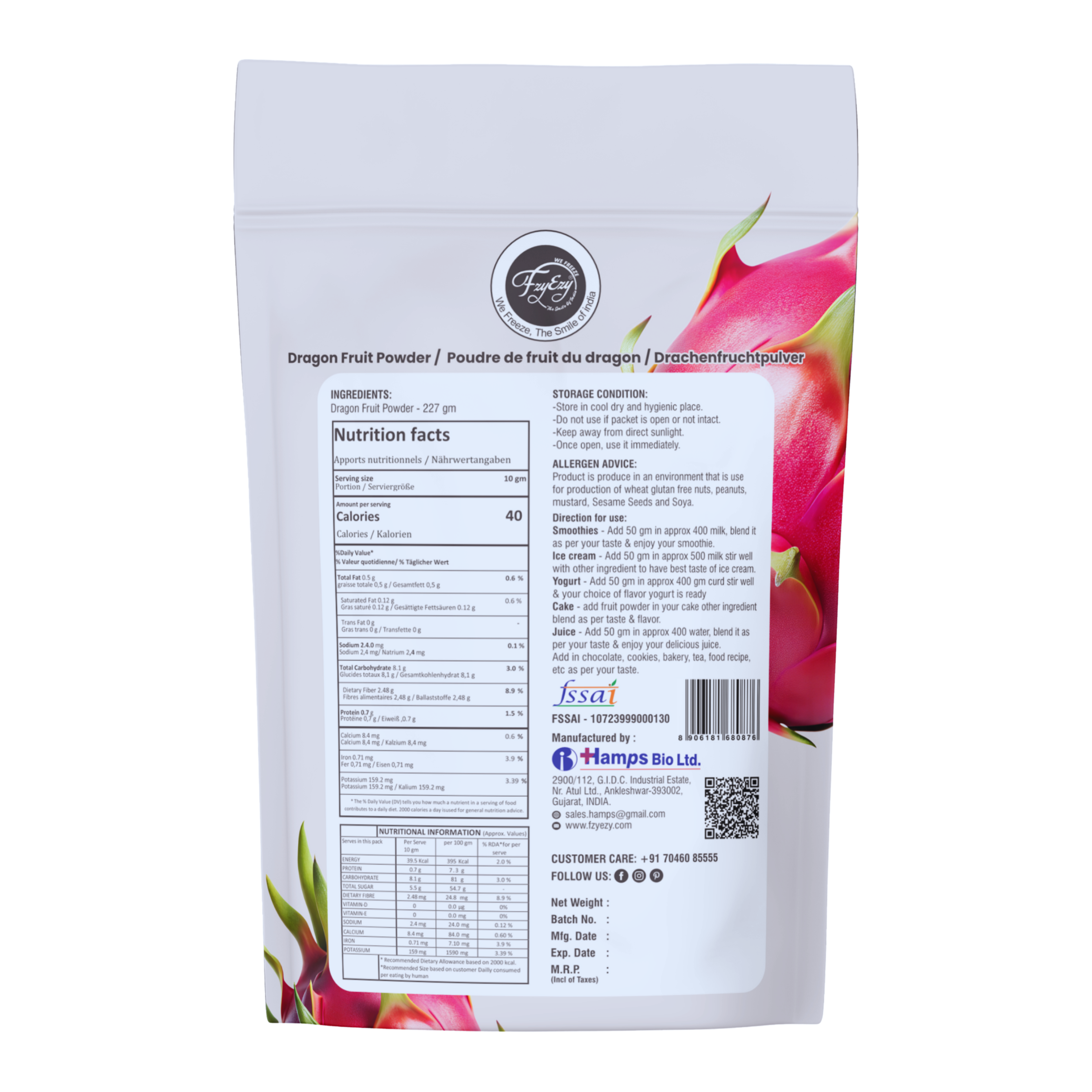 🌺 FzyEzy Freeze-Dried Dragon Fruit Powder is a vibrant superfood made from premium pink dragon fruit, gently freeze-dried to preserve its intense color, tropical flavor, and powerful nutrients. Packed with antioxidants, fiber, and vitamins, it’s the perfect natural booster for your everyday recipes — colorful, clean, and 100% real fruit.