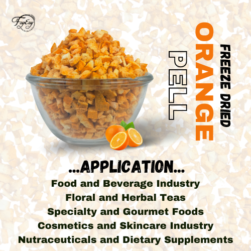 Freeze Dried Orange Peel Flakes Cut can be mixed with other flakes, used as a topping for fruit bowls, or added to vegetables as a flavor enhancer. It's also great for adding to ice creams, cakes, yogurt, flavored teas, muesli bowls, pancakes, waffles, chocolates, and other desserts to create unique dishes with a zesty orange flavor.